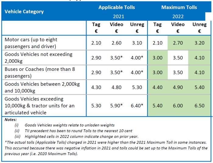 The 2022 Maximum Tolls are calculated for each road (by vehicle category) in accordance with the individual toll road Bye-Laws. Base Tolls (by vehicle category) are set out in the Bye-Laws together with a baseline CPI (the “Opening Index”). The Base Tolls are inflated by a CPI indexation factor (i.e. CPIAugust 2021/CPIOpening Index). The applicable VAT rate is then added and the toll rounded (to the nearest 10 cents in the case of PPP concessions and the M50, and to 50 cents in the case of Dublin Tunnel). This establishes the Maximum Toll for each vehicle category. The actual tolls charged cannot be higher than the Maximum Tolls calculated. VAT is not applicable on the M50 or Dublin Tunnel tolls.