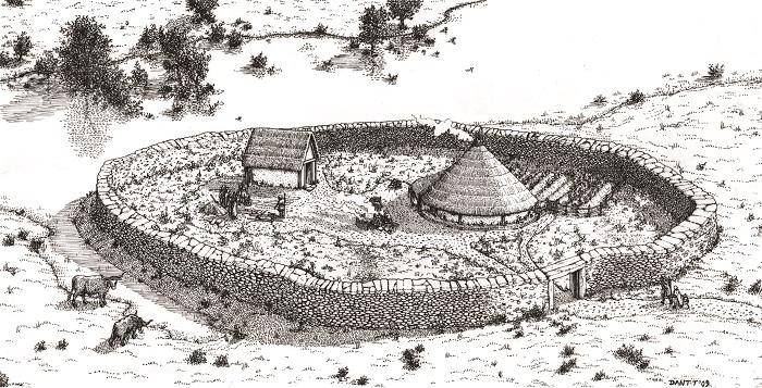 Reconstruction of the early medieval cemetery-settlement at Owenbristy, Co. Galway. Drawn by Dan Tietzsch-Tyler.